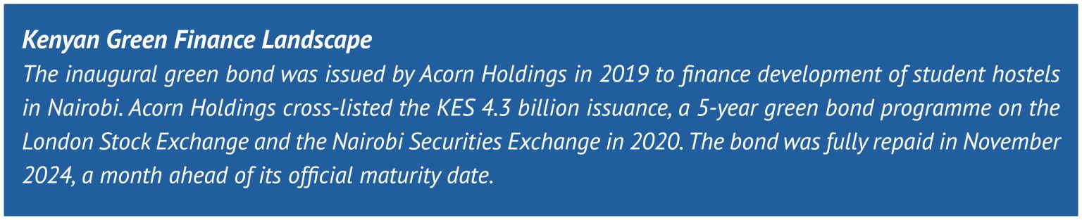 Despite the capital markets offering an avenue for long-term local currency funding and domestic resource mobilisation, it remains largely underutilized as sustainable finance capital inflow in Kenya has been supported by several external sources including Development Finance Institutions (e.g. International Finance Corporation, European Investment Bank and Africa Development Bank), Multilateral Development Banks (MDBs), Multilateral Climate Funds (like the Green Climate Fund and Global Environment Facility), as well as government contributions and private sector players. Over the last five years, six public bonds have been issued in the Kenyan capital market, with only one being a green bond, a telling indicator that this avenue for capital raising remains untapped. While we recognise that multiple private and bilateral green financing transactions have occurred in the Kenyan market over the same period, we note that one prominent private green note issuance from Burn Manufacturing USA LLC (Kenya Branch) occurred in October 2023 for financing clean cookstoves across Sub-Saharan Africa.
